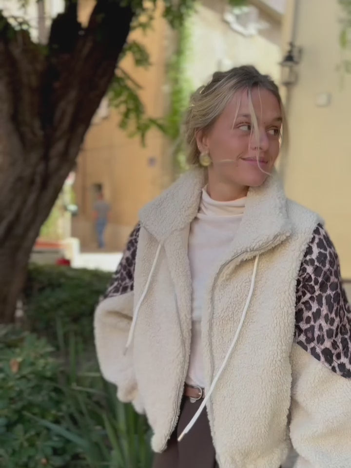 Veste moumoute écrue à empiècements léopard - RIVE GAUCHE